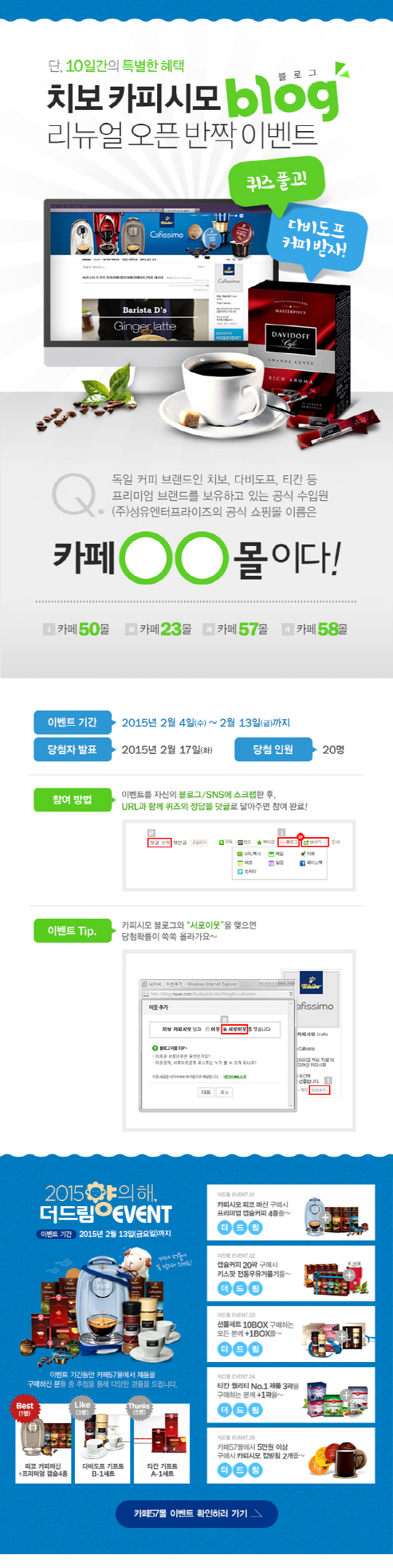 새롭게 단장한 치보 카피시모 공식 블로그는 브랜드 소개 및 다양한 브랜드 활동 내용을 비롯하여 이벤트 공지, 특별 레시피, 서포터즈 후기, 패밀리 브랜드(Family Brand) 다비도프 카페, 기라델리, 티칸 티 소식 등 전문적이고 다양한 정보를 전달한다. 이번 이벤트는 치보 카피시모 공식 블로그(http://cafissimo.blog.me) 퀴즈 이벤트를 개인 블로그 및 SNS 스크랩 후 URL과 함께 퀴즈 정답을 덧글로 남기면 된다.
