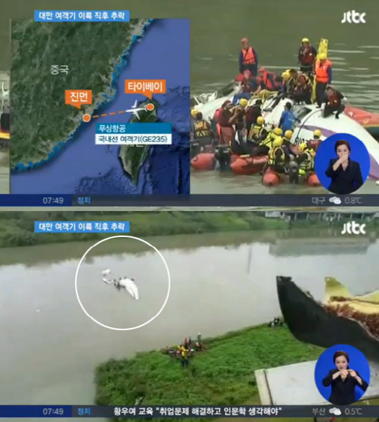 지난 4일 대만 중앙통신사(CNA)는 "타이베이 쑹산국제공항을 출발해 진먼(金門)으로 향하던 푸싱(復興)항공 B22816편이 10시 56분쯤 인근 고가도로 상단을 들이받고 지룽(基隆)천으로 추락했다"고 보도했다.