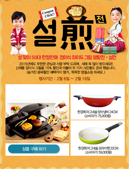 오는 2월 13일까지 한경희생활과학 온라인 공식 쇼핑몰(http://www.ihaan.com/index.htm)에서 진행되는 이번 프로모션은 '설 맞이, 한정판매 접이식 와이드 그릴 쟁탈전 (설전)'을 컨셉으로 선착순 50명의 고객에게 신제품 '한경희 접이식 와이드그릴' 15% 할인과 사은품 2종 증정의 혜택을 제공한다.