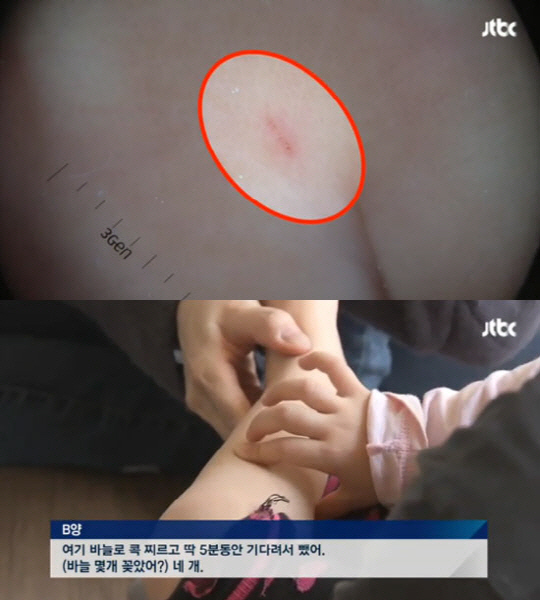 이날 JTBC는 해당 어린이집 아이들과의 인터뷰를 시도했다. A양은 손등을 잡고 바늘로 찌르고 5분 동안 기다렸다 뺀 다음에 닦았다고 말했다.