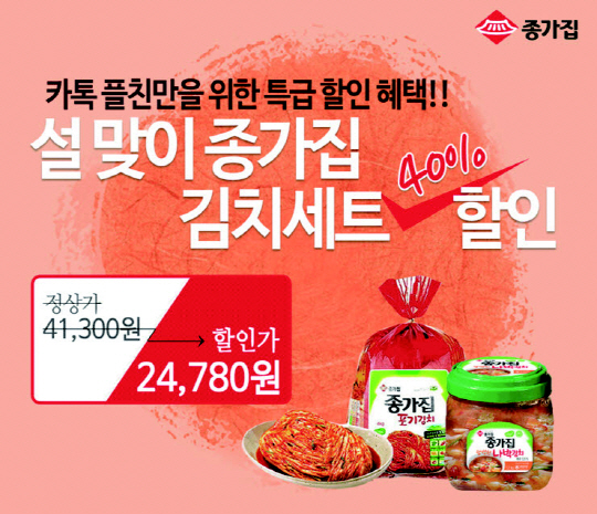대상FNF(대표 이상철) 종가집이 종가집 카카오톡 플러스 친구를 대상으로 설맞이 김치세트 할인 이벤트를 오는 11일(수)까지 실시한다.