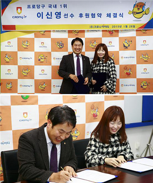 ◇(사진 위) 크로니아이티이해관 대표(왼쪽)와 이신영 선수가 후원협약 체결식 후 기념촬영을 하고 있다. (아래) 크로니아이티이해관 대표(왼쪽)와 이신영 선수가 후원협약서에 사인하고 있다.