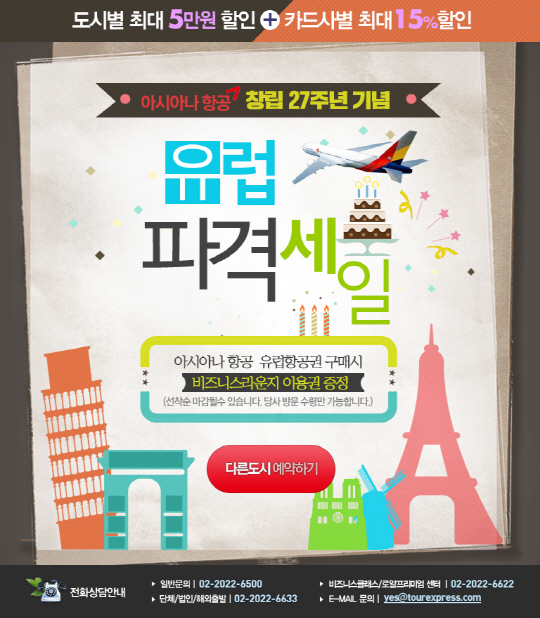 SM C&C 투어익스프레스(사장 송경애)가 아시아나 항공 창립 27주년을 기념해 유럽 파격 세일 기획전을 진행한다.