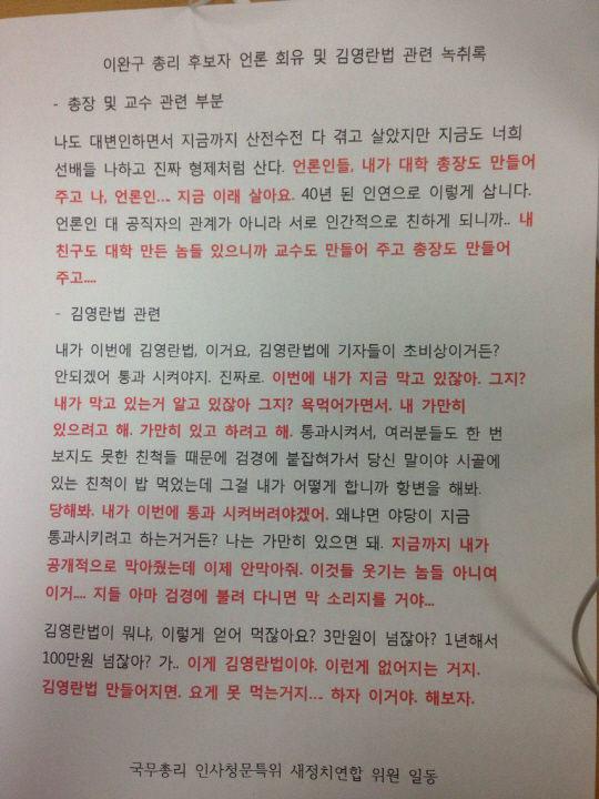 새정치연합 의원이 공개한 이완구 녹취록에는 크게 언론인 회유와 김영란법 관련한 내용이 담겨 있다. 녹취록을 정리한 문서에는 "언론인들 내가 대학 총장도 만들어주고, 교수도 만들어준 친구도 있다"는 내용과 "김영란법 내가 막고 있잖아 욕먹어가면서...이제 안막아줘. 김영란법이 뭐냐. 이렇게 얻어 먹잖아요? 3만원이 넘잖아? 1년해서 100만원 넘잖아? 이런게 없어지는거지. 요게 못 먹는거지. 하자 이거야 해보자" 등의 발언이 담겨있다.