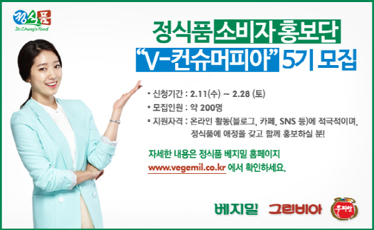 건강과 두유에 관심 많거나 온라인 활동에 적극적인 분이라면 누구나 베지밀 홍보단 'V컨슈머피아'에 지원 가능하다. 지원 방법은 정식품 홈페이지(www.vegemil.co.kr) 회원 가입 후 지원서를 작성하면 된다. 모집은 오는 2월 28일까지이며, 결과는 3월 6일 정식품 홈페이지를 통해 공지할 예정이다.