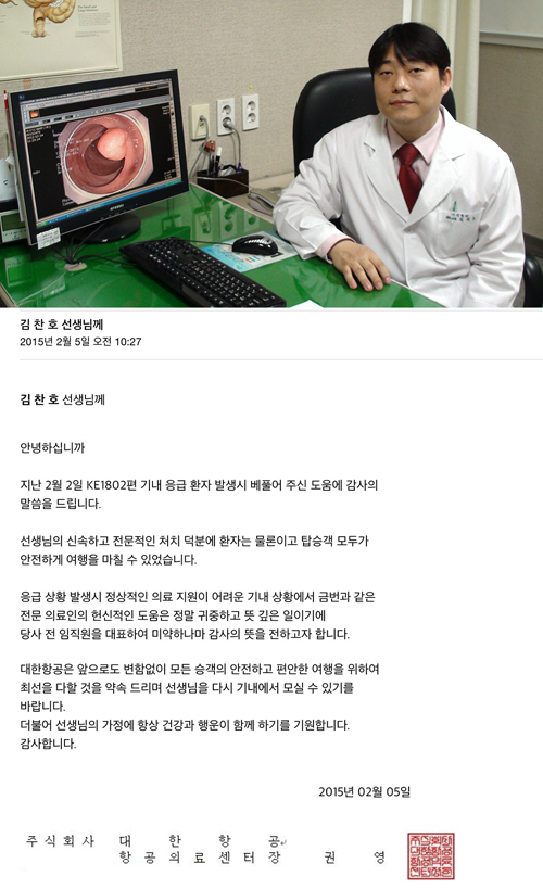 최근 대한항공 측은 지난 2월 2일 제주발 대구행 대한항공 KE1802편에서 기내 응급환자가 발생해 도움을 준 세강병원 김찬호 과장에게 감사의 서신을 보내왔다.