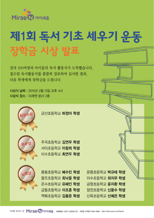 미래엔 아이세움은 이날 시상식에서 서울 금천구 금산초등학교 하정아 학생에게 최우수상에 해당하는 장학금 50만 원을 수여하고 경기도 남양주시 주곡초교 김연우 학생, 서울시 서초구 서이초교 이창희 학생, 전남 순천시 이수초교 최연우 학생 등 우수상 3명에게는 장학금 30만 원을, 노력상 10명에게는 장학금 10만 원을 각각 수여한다.