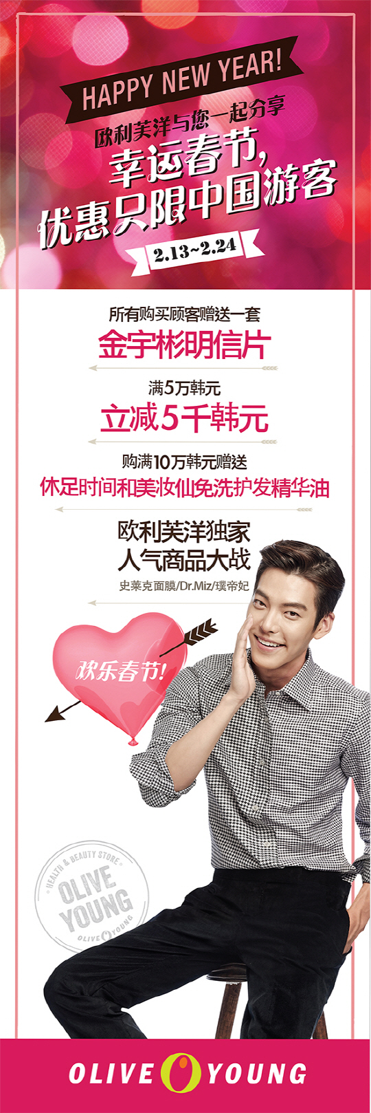 올리브영 마케팅 담당자는 "중국인들이 주로 쇼핑하는 화장품은 마스크팩, 화이트닝, 보습 등의 스킨케어 제품뿐만 아니라 최근에는 헤어 제품에 대한 관심이 부쩍 늘었다"며 "올해 춘절 기간에는 중국인들이 선호하는 뷰티 상품과 한류스타 김우빈을 앞세워 서울과 부산, 제주 등 관광 상권 중심으로 다양한 마케팅을 진행할 계획"이라고 전했다.