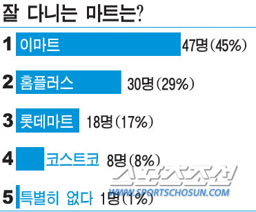 주부평가단은 이마트를 가장 자주 찾았다. 104명중 47명, 45%가 표를 던졌다. 2위는 홈플러스였다. 30명, 29%가 손을 들었다.