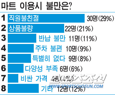 주부평가단은 불만도 함께 털어놓았다. '직원불친절'에 따른 불편이 가장 많았다. 총 30명, 29%를 차지했다. 구체적으로 "상품문의시 답변 지연", "비전문성으로 인한 답변 불친절" 등 답변에 대한 불만이 많았다. "직원의 불친절은 소비자를 불편하게 만드는 주원인"이라고 따끔하게 지적한 주부도 있었다. 상대적으로 롯데마트와 코스트코가 많았다.