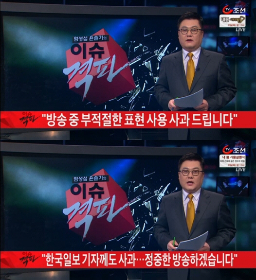 엄성섭 앵커는 이어 "한국일보 기자께도 사과드린다"며 "정중한 방송하도록 하겠다"고 말했다.