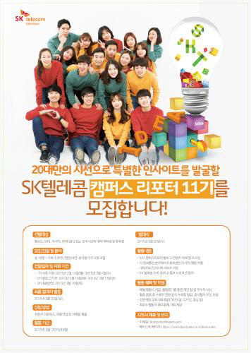SK텔레콤(사장 장동현, www.sktelecom.com)은 대학생들과의 소통 및 ICT 관련 인재 육성을 위해 지난 2009년부터 운영 중인 SK텔레콤 캠퍼스리포터 11기를 3월 4일까지 모집한다고 밝혔다.