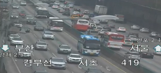 현재 경부고속도로 부산 방향은 수원신갈나들목→안성분기점, 잠원나들목→반포나들목, 망향휴게소→천안휴게소 등 34.75㎞ 구간에서 정체를 빚고 있다.