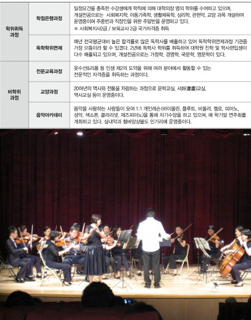 성인학습자를 대상으로 진행되는 교육과정은 학위과정(학점은행과정, 독학학위과정), 비학위과정(교양, 전문가과정, 음악아카데미 등)으로 진행되며 2015년 봄학기 진행되는 프로그램은 아래와 같다.