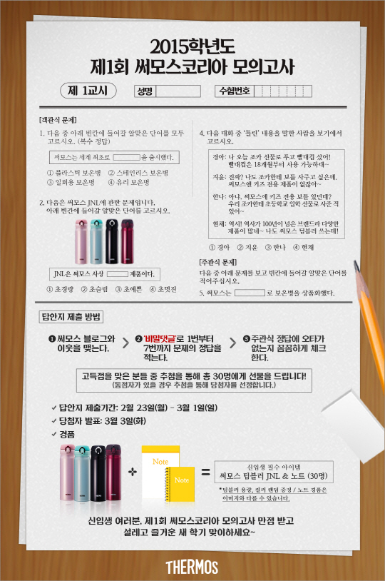 글로벌 보온병 브랜드 써모스코리아(대표 야마구치 히토시, www.thermos.kr)가 신학기를 맞이해 '2015학년도 제 1회 써모스코리아 모의고사' 이벤트를 3월 1일까지 실시한다.