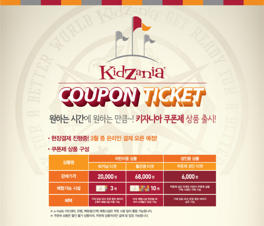 어린이용 쿠폰제 상품은 3개 체험시설에 한해 하루 동안 자유롭게 키자니아를 이용할 수 있는 '비기닝 티켓(2만원)과 10가지 체험시설을 3개월의 유효기간 내 할 수 있는 '월간권 티켓(6만8000원)'으로 나뉜다. 어린이용 쿠폰을 구매한 보호자에 한해 키자니아 입장료 우대 혜택을 제공하는 '쿠폰제 성인 티켓(6000원)'도 마련됐다.