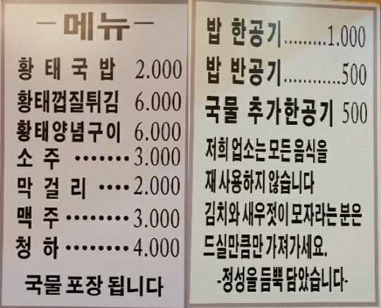 황태국밥(2000원), 황태껍질튀김(6000원), 황태양념구이(6000원) 등 단출한 메뉴에 다른 식당에 비해 월등히 저렴한 가격이 눈길을 끈다.