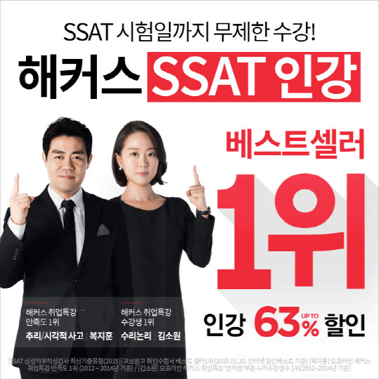 'SSAT 패키지'는 베스트셀러 1위 "해커스잡 SSAT 최신기출유형(2015)'(교보문고 취업수험서 베스트셀러, 2015.01.20/인터넷일간베스트기준) 교재를 활용하는 강의로, 수리/추리/상식/언어 각 영역별 전문 강사의 강의를 통해 전문적인 인적성 대비가 가능하다. 수강료의 63% 할인을 받을 수 있는 'SSAT 패키지'는 물론, 57% 할인 혜택을 받을 수 있는 'SSAT+오픽 패키지'도 추가로 마련해 스피킹 점수가 필요한 취준생들에게까지 선택의 폭을 넓혔다.