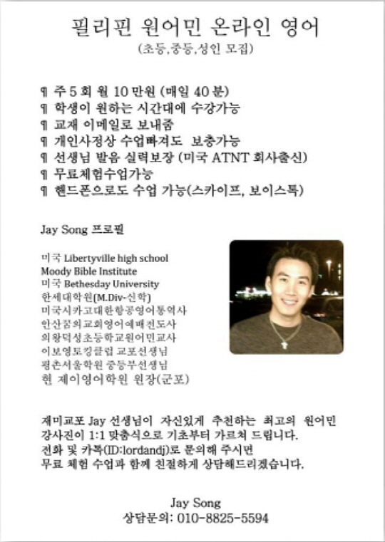 글로벌 시대에 영어는 필수다. 그렇다면 어떻게 영어공부를 하면 좋을까? 그것을 고민하는 사람들에게 쉽고도 즐거운 '국내에서의 어학연수'로 방법을 제시하는 사람이 있어 화제다. 제이영어의 제이송(송재헌) 대표. 그는 월 10만원의 국내선 비행기 값도 안되는 저렴한 비용으로, 주5회 40분 강의, 원어민 1:1 맞춤식 강의로 '책상 앞 어학연수'로 관심을 모으고 있다. 미국 유명 회사 직원, 영어 교사 출신의 최고 원어민 강사진과 엄격한 강사관리 및 차별화된 레벨 교육 시스템으로 영어 말문이 트이도록 실력향상을 돕고 있다.