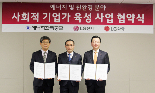 에너지관리공단이 26일 LG전자·LG화학과 LG트윈타워에서 '에너지분야 사회적 기업가 육성 프로그램'을 위한 업무협약을 체결했다고 밝혔다. 업무협약의 내용은 영업활동을 통한 수익창출과 취약계층 일자리 창출, 사회서비스 제공 등 사회적 목적을 추구하는 조직 및 사회적 기업가를 지원하는 게 골자다.
