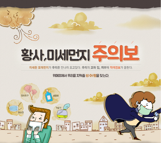 한편 위메프는 3월 대형 황사에 대비해 위생용품과 청소용품 등 다양한 황사 관련 상품들을 최대 50% 할인 판매하는 '황사, 미세먼지 주의보' 기획전을 진행 중이다. 마스크는 KF80 이상 제품인 '크리넥스 황사마스크', '파인텍 황사마스크 S100', '애니가드 황사마스크' 등을 준비했고 천연 가습기, 손 세정제 등도 할인된 가격에 판매한다. 오염먼지를 차단하는 '3M 창문용 환기필터'는 1만9천원부터 선보인다. 더블클린 시스템으로 미세먼지, 냄새까지 잡아주는 '삼성 공기청정기'는 21만9천원, 소셜커머스 단독으로 선보이는 '위니아 에어워셔 엘리트'는 32% 할인된 11만9천원에 판매한다. 명품 청소기 다이슨의 알러지 케어 청소기 '핸디&스틱 진공청소기 DC45'를 36% 할인한 47만8000원에 선보인다.