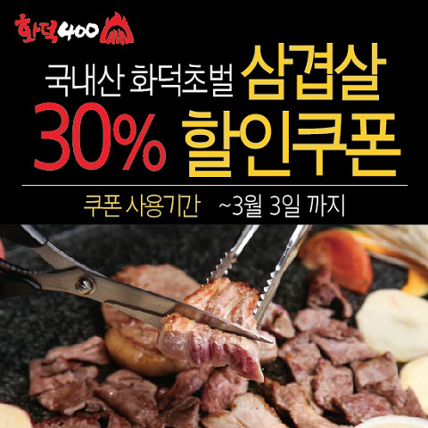 카카오톡에서는 3월 3일까지 '화덕400'과 친구를 맺으면 '삼겹살 30% 할인'이라는 파격적인 쿠폰을 발행한다. 삼겹살데이를 맞아 고객감사의 의미로 마련한 이번 이벤트는 쿠폰 사용시 횟수제한이 없고 보여주기만 하면 바로 적용이 가능해 더욱 환영받을 것으로 보인다. 발빠르게 SNS로 소식이 알려지면서 벌써부터 문의와 예약이 이어지고 있다는 것이 업체 측의 설명이다. 화덕400의 서울 역삼직영점, 부산 해운대 프리미엄점, 부산 수영점 모든 매장에서 이용가능하다.