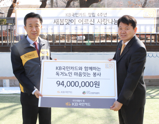 KB국민카드는 이날 봉사 활동에 앞서 독거 노인들의 생활 안정과 지원 사업을 위한 기부금 9천 4백만원을 '독거노인종합지원센터'에 전달했다.