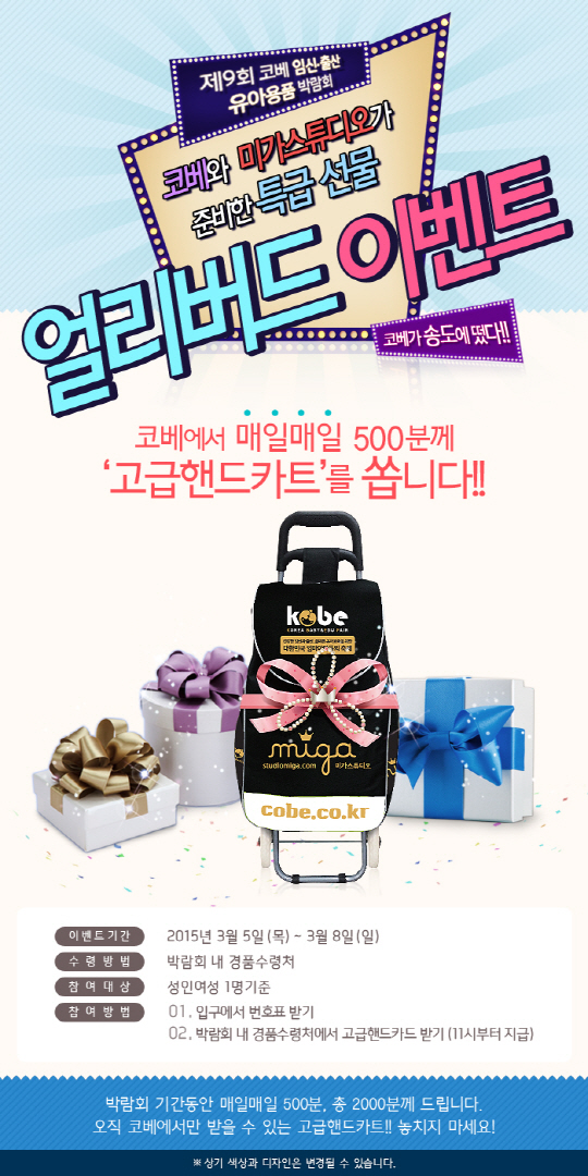 코베는 행사 기간 내 박람회를 보러 온 방문객들을 대상으로 고급핸드카트를 증정하는 '얼리버드 이벤트'를 진행한다. 얼리버드 이벤트는 전시회장 입구에서 선착순으로 번호표를 지급하며, 지급받은 번호표를 가지고 박람회 내 경품 수령처에 가면 오전 11시부터 고급핸드카트를 받을 수 있다. 단, 박람회 기간 중 일일 한정 500명에 한하며, 성인여성 1명만 가능하다.