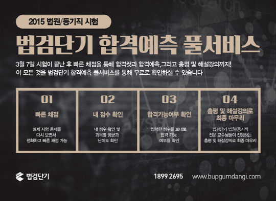 법원 및 검찰직 공무원시험 전문 '법검단기(www.bupgumdangi.com)'가 7일 시행되는 법원직/등기직 시험 직후, 수험생들을 위한 2015년 법원직/등기직 시험 완벽분석 합격예측 풀서비스를 실시한다.