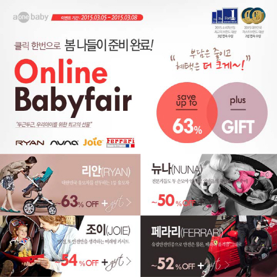 한편, 에이원은 같은 기간 수도권과 지방의 고객들을 위해 에이원의 인기 상품을 직접 보고 체험하고 구매할 수 있도록 인천 송도 컨벤시아의 '코베 베이비페어'와 부산 벡스코의 '2015 부산 베이비페어'에도 참가한다.