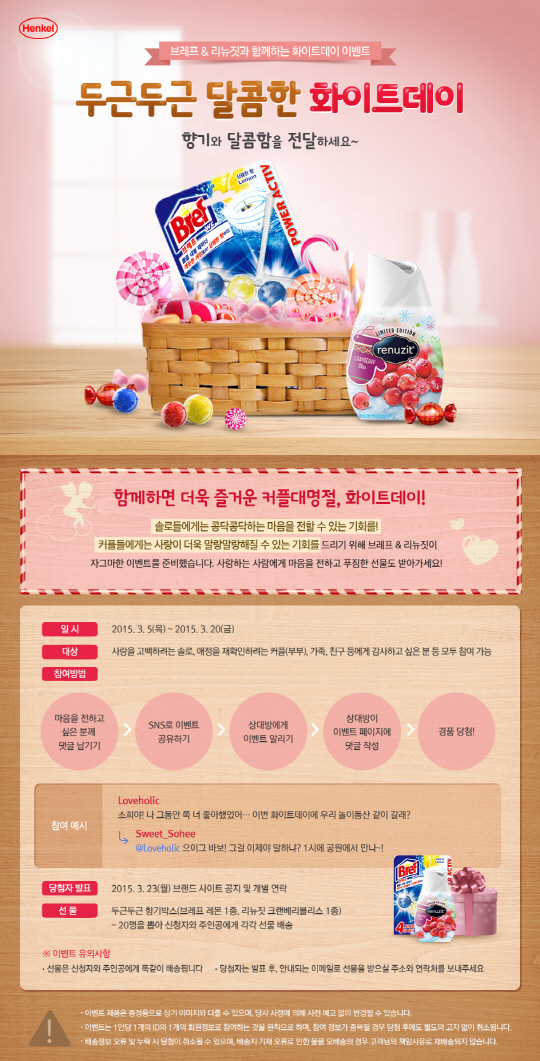 헨켈홈케어코리아는 참여자 중 20명을 선정해 신청자와 주인공 등 총 40명에게 '두근두근 향기박스'를 증정하며 당첨자는 23일 홈페이지와 개별 공지를 통해 발표할 예정이다.