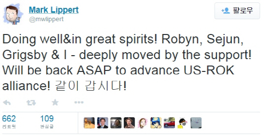 리퍼트 대사는 "(아내) 로빈과 (아들) 세준이, (애견) 그릭스비와 저는 지지에 깊이 감동을 받았다"면서 "한미동맹의 진전을 위해 최대한 가장 이른 시일 내에 돌아올 것"이라며 썼다.