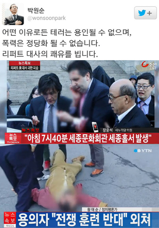 박원순 시장은 5일 자신의 트위터에 "어떤 이유로든 테러는 용인될 수 없으며 폭력은 정당화될 수 없다"면서 "리퍼트 대사의 쾌유를 빕니다"라고 전했다.
