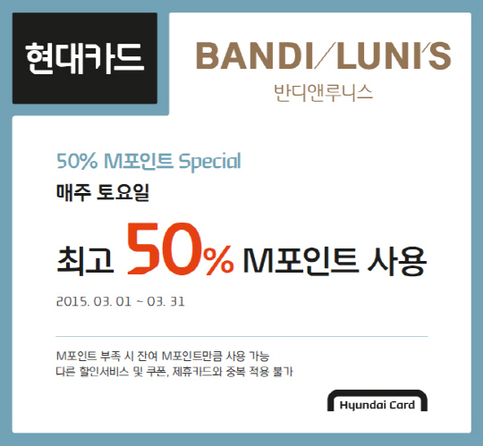 반디앤루니스(대표이사 김동국, www.bnl.co.kr)는 서점 업계에서 단독으로 3월 한달 간 매주 토요일마다 도서 등의 제품을 사면 구매 금액의 50%를 현대카드 M포인트로 결제할 수 있는 이벤트를 진행한다. 이번 이벤트는 역세권에 위치한 반디앤루니스 5개 매장(코엑스점, 센트럴시티점, 종로타워점, 사당역점, 신림역점)에서 3월 한 달 동안 매주 토요일 7일, 14일, 21일, 28일에 진행된다. 반디앤루니스에서 판매하는 모든 도서는 물론 문구류, 음반 등 전 품목을 구매할 때 결제 금액의 50%를 현대카드 M포인트로 결제할 수 있다.