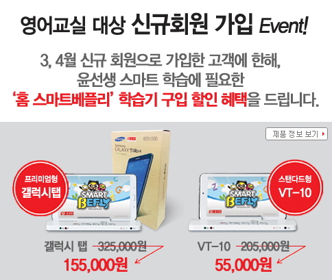 이번 이벤트는 학습기간을 10개월 또는 15개월로 약정하는 윤선생영어교실(방문학습) 회원을 대상으로 하며 프리미엄 단말기(갤럭시탭)와 스탠다드 단말기(VT-10)에 모두 적용된다. 프리미엄 모델은 38만5000원 상당의 단말기를 최대 15만5000원까지, 스탠다드 모델은 정가 20만5000원의 단말기를 최대 5만5000원까지 각각 할인해준다. 자세한 내용은 윤스닷컴 홈페이지(www.yoons.com) 또는 고객센터(1588-0594)에서 확인할 수 있다.