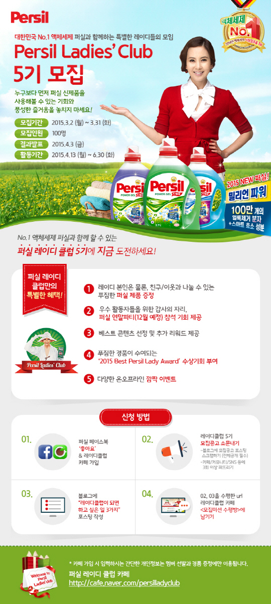 모집 기간은 31일까지이며, 모집 공고 내용을 개인 SNS에 3회 이상 공유하고 블로그에 각오를 담은 포스팅을 작성한 후 공식 카페(cafe.naver.com/persilladyclub)에 올리면 신청이 완료된다. 결과는 4월 3일 발표한다.