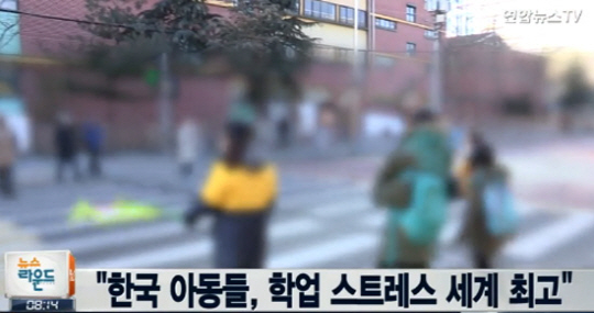 한국 아동 학업 스트레스 지수는 전체 평균 33.3%보다 17.2%포인트나 높은 것으로 가장 낮은 네덜란드(16.8%)의 3배나 됐다.