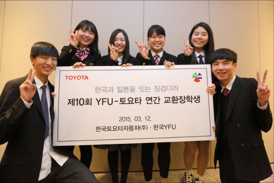 한국토요타자동차와 한국YFU(Youth For Understanding, 국제학생교류회)는 '연간 일본 교환장학생 프로그램'의 일환으로 지난 12일 서울 중구 더플라자 호텔에서 교환학생들의 환영·환송 행사를 가졌다. '연간 일본 교환장학생 프로그램'은 한국토요타자동차와 토요타자동차가 매년 각국 학생 2명씩을 선발하여 한국과 일본 고등학교에서의 1년간 유학 및 각 나라의 문화 체험 기회를 제공하는 한일 청소년 교환 프로그램이다.