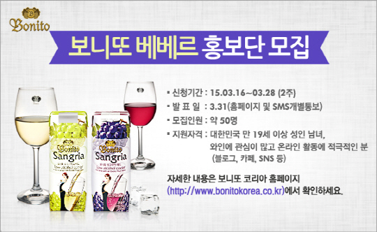국내 최초 팩 와인을 선보이며 와인 대중화를 선도하고 있는 ㈜보니또 코리아(대표 최종호, www.bonitokorea.co.kr)가 '보니또 베베르' 홍보단 3기를 모집한다고 16일 밝혔다.