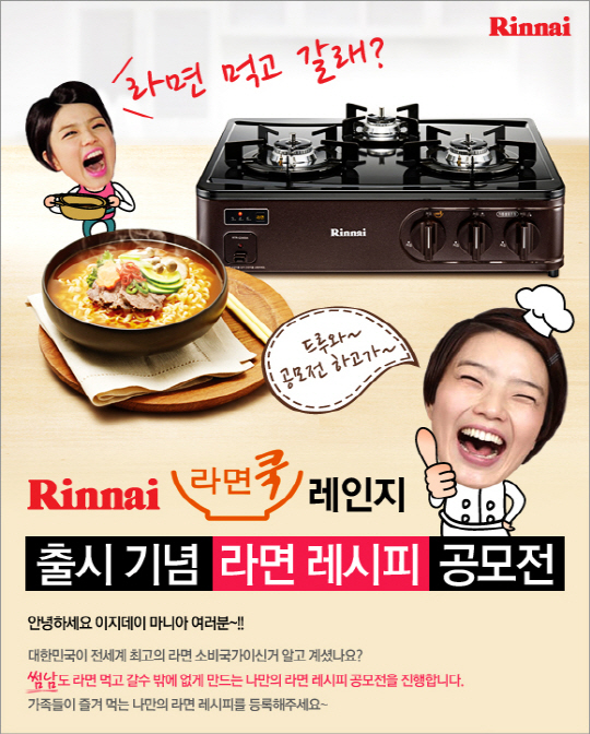 린나이코리아(대표 강영철, www.rinnai.co.kr)는 국내 최초로 타이머 설정을 통해 자동으로 라면을 완성시켜주는 '라면쿡 레인지'(모델명:RTR-Q3400A)출시를 기념하여 여성 포털사이트 이지데이(www.ezday.co.kr)와 함께 라면 레시피 공모전 이벤트를 진행한다고 밝혔다.