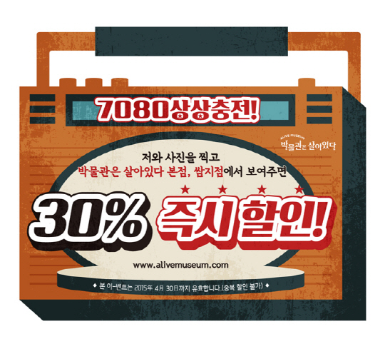 이번 이벤트는 최근 방송과 공연계에 불고 있는 복고 열풍의 중심에 선 7080년생을 위해 마련됐다. 70년생부터 89년생까지면 누구나 '박물관은 살아있다' 인사동 본점과 쌈지점 입장권 구매 시 20% 할인혜택을 받을 수 있다. 주민등록증 또는 자동차운전면허증 등을 제시해 생년월일을 확인하면 된다.