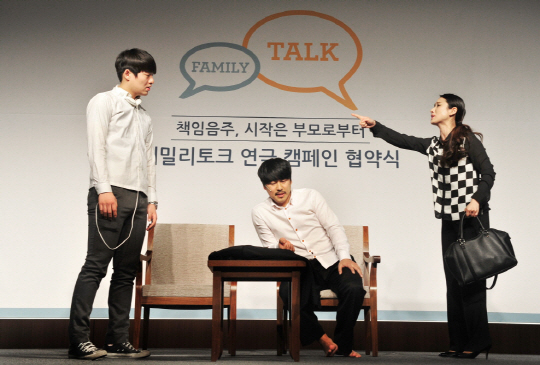 | 13일 서울 종로구 그랑서울에서 오비맥주는 사단법인 한국메세나협회, 극단 오늘무대와 '패밀리토크 연극 캠페인 협약식'을 갖고 '가족대화'를 주제로 한 창작연극을 공동 제작해 청소년 음주예방을 위한 상시 캠페인에 나서기로 했다. 극단 오늘무대의 배우들이 부모와 자녀 간 효과적인 대화법을 알려주는 이야기가 담긴 연극을 시연하고 있다. |