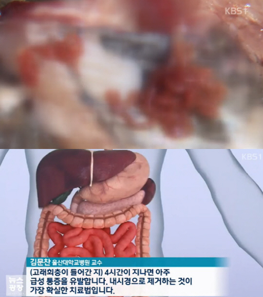 김문찬 울산대학교 병원 교수는 "(고래 회충이 몸속으로 들어간 지) 4시간이 지나면 아주 급성통증을 유발한다. 내시경으로 제거하는 것이 가장 확실한 치료법이다"고 설명했다.