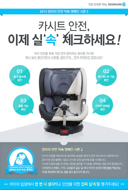 유아용 카시트 전문 기업 ㈜순성산업(대표 이덕삼 www.soonsung.com)이 엄마의 안전 약속 캠페인 시즌 2 '카시트 안전, 이제 실'속' 체크하세요'를 시작한다.