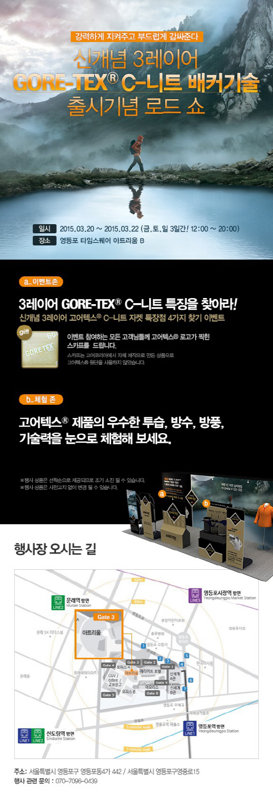 고어코리아는 '새로운 고어 C-니트 배커 기술을 적용한 3레이어 고어텍스 제품(New 3 Layer GORE-TEX Products with GORE C-KNIT Backer Technology)' 출시를 기념해 3월 20일부터 22일까지 영등포 타임스퀘어 아트리움B에서 '고어텍스 C-니트 로드쇼'를 개최한다.