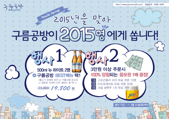 구름공방에 따르면 인기 메뉴인 불고기 로메인 피자?구름크림 파스타?청포도 리코타 치즈 샐러드 중 한 가지와 500ml 뉴 하이트 2병을 할인된 가격에 제공한다. 3만원 이상 주문 시에는 100% 당첨되는 응모권 1매도 제공된다.