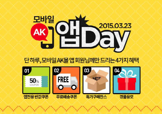 온라인쇼핑몰 AK몰(www.akmall.com)은 3월23일 단 하루 동안 '모바일 앱데이'를 열고, 50% 할인쿠폰 1만장 등 모바일 앱에서만 사용 가능한 다양한 혜택을 제공한다.