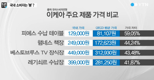 또한 ▲햄네스 책장 블랙브라운(한국 24만9천원·OECD 평균 17만2천623원) ▲베스토부루스 TV장식장 하이글로스옐로우(한국 44만9천원·OECD 평균 31만2천930원) ▲레기쇠르 유리도어 수납장 브라운 (한국 39만9천원·OECD 평균 28만1천250원) 등도 국내 판매가격이 비쌌다.