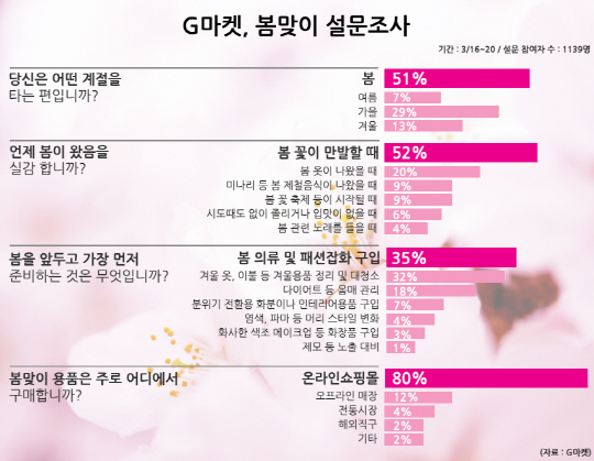 국내 최대 온라인쇼핑사이트 G마켓(www.gmarket.co.kr)이 3월 16일부터 20일까지 고객 1139명을 대상으로 봄맞이 설문조사를 실시한 결과 응답자 2명 중 1명이 사계절 중 가장 많이 타는 계절로 '봄'을 꼽았다고 22일 밝혔다.