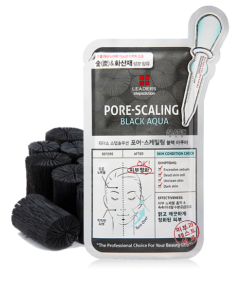 리더스코스메틱의 스텝솔루션 포어-스케일링 블랙 아쿠아 마스크는 최고급 숯의 일종인 비장탄과 화산재 성분이 함유돼 있어 피부 자체 보습력과 정화 기능을 높여 주고 각질을 정돈해 외부 유해 환경으로부터 피부를 지켜준다.